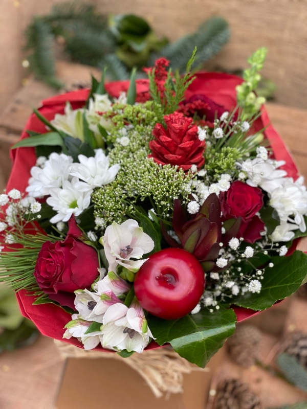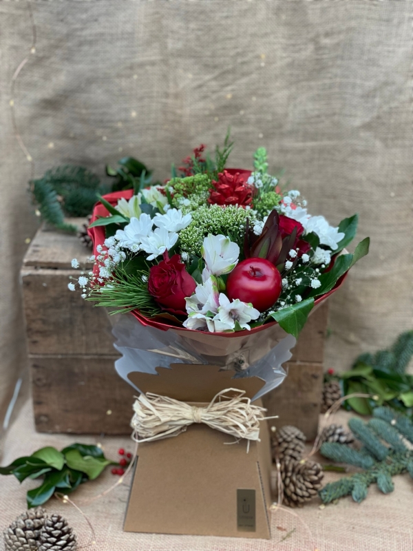 Eco Range. A beautiful Christmas mix of fresh seasonal flowers, paper wrap, box and raffia bow
