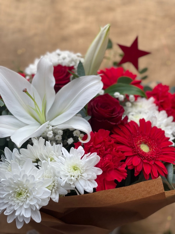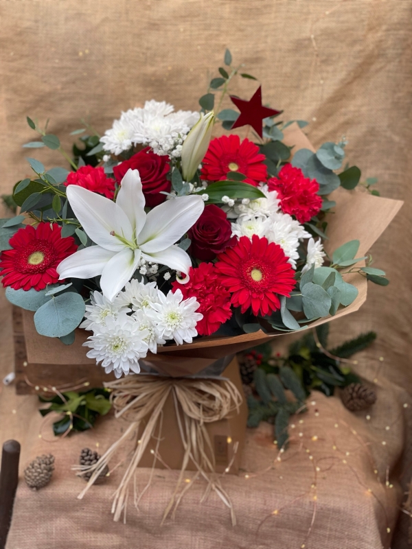 Eco Range. A beautiful bouquet of reds and whites for Christmas, in a kraft paper wrap, presentation box and raffia bow. A real classic for Christmas. (Please note that product may differ from what is shown in picture, we strive to make the bouquets as close as possible to images shown, however some flowers may be substituted to provided the freshest most satisfactory product)