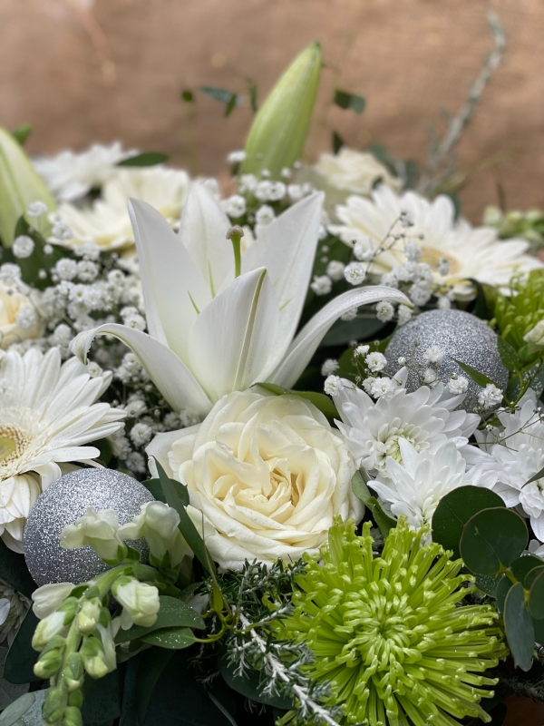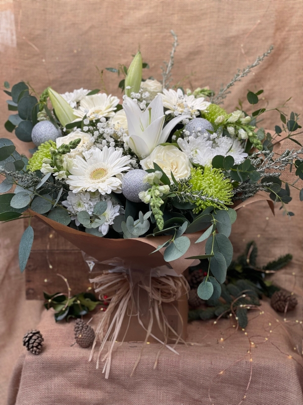 Eco Range. A beautiful selection of white Lillie's, Roses & Gerberas, a favourite in a kraft paper wrap, presentation box and raffia bow.